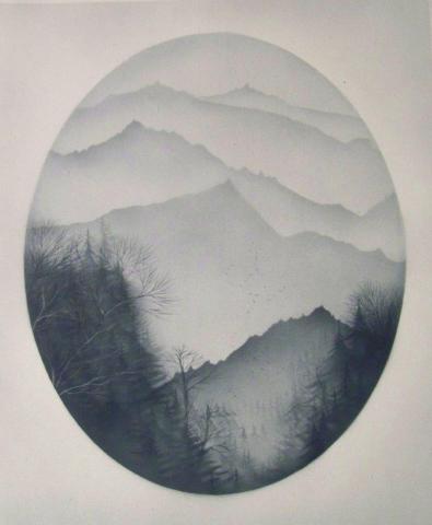The painting is a serene and mystical landscape, encapsulated within an oval frame. Layered mountains fade into the distance, creating depth and tranquility. The monochromatic grey shades add to the ethereal quality, while delicate silhouetted trees in the foreground contrast with the misty mountains. The absence of a visible sky allows the rhythmic pattern of the mountains to lead the eye upwards, contributing to the tranquil and mystical mood of the piece.