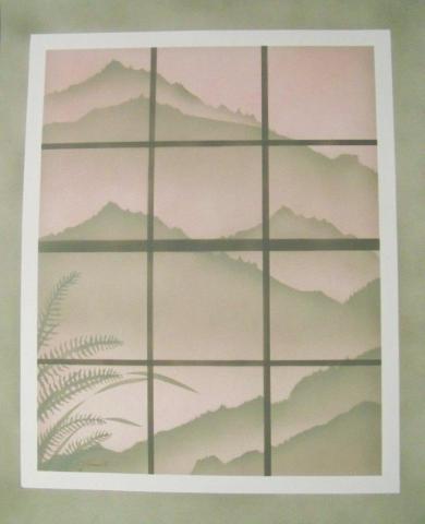 The painting offers a view of tranquil mountains through a window with square panes, where the soft tones of the landscape contrast with the structured lines of the window. A single ring hangs from an upper pane, adding intrigue, while a delicate fern in the foreground introduces a touch of life and vibrancy to the peaceful scene. The overall mood is one of calm serenity, inviting reflection on the beauty of the natural world framed by human perspective.