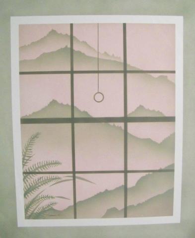The painting offers a view of tranquil mountains through a window with square panes, where the soft tones of the landscape contrast with the structured lines of the window. A single ring hangs from an upper pane, adding intrigue, while a delicate fern in the foreground introduces a touch of life and vibrancy to the peaceful scene. The overall mood is one of calm serenity, inviting reflection on the beauty of the natural world framed by human perspective.