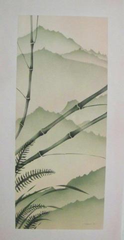 The painting portrays a serene natural setting, featuring slender bamboo stalks that lean gracefully to the right, adorned with delicate leaves. The background is a soft blend of green and white, suggesting misty mountains that recede into the distance, creating a sense of depth. The minimalist use of color and detail emphasizes the elegance and simplicity of nature, evoking a feeling of calmness and peace.