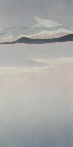 The painting portrays a tranquil landscape, where the dark silhouettes of mountain-like formations rise against a lighter sky. The soft hues of lavender and white merge to create an ethereal atmosphere, with the misty foreground extending into the distance. This scene invites viewers into a peaceful realm where nature’s silent beauty is paramount, and the overall mood is one of calm solitude.