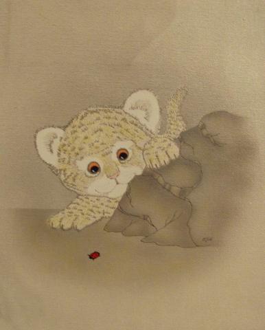 This painting is a realistic depiction of a small white cub with big orange eyes, perched on a rock and looking at a small red ladybug. The cub’s fur is fluffy and soft, and its eyes are curious and playful. The rock is gray and rough, creating a contrast with the cub’s smoothness and brightness. The background is a beige color, making the cub and the ladybug stand out. The painting is signed by the artist in the bottom right corner. The painting portrays the cub’s innocence and cuteness, as well as the beauty and wonder of nature.