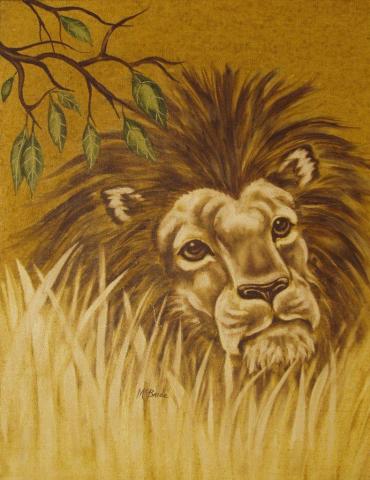 The painting presents a lion’s head as the central focus, emerging from a field of tall grass. The lion’s mane is dark, creating a striking contrast against the warm golden background. A tree branch with leaves adorns the top left corner, adding a touch of greenery to the scene. The lion’s face is detailed and expressive, capturing the essence of this majestic creature with an air of nobility and strength. The composition’s centering of the lion’s head draws the viewer’s attention directly to the animal’s piercing gaze, while the impressionistic style conveys the wild and natural environment in which it resides.