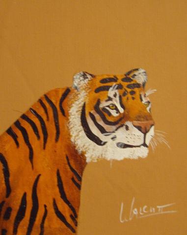 The artwork features the head and upper body of a tiger, depicted with a keen attention to detail. The tiger, facing the right side of the image, is rendered in vivid orange and black stripes that capture the essence of its wild beauty. The dark brown background serves to accentuate the tiger’s form, making it stand out with a sense of depth and intensity. Signed in the bottom right corner, the painting is a testament to the artist’s skill in portraying the powerful grace of one of nature’s most majestic creatures.