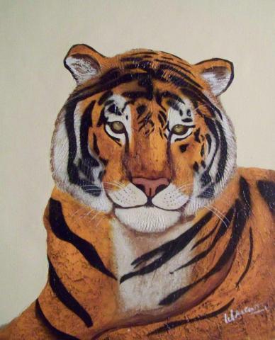 The painting captures the essence of serenity with a tiger’s head and upper body portrayed against a solid beige backdrop. The tiger, depicted with a calm demeanor, looks directly at the viewer, creating an intimate connection. Its fur, a striking combination of orange, black, and white, is detailed in a way that brings out the natural elegance of the animal. The artist’s signature in the bottom right corner adds a personal touch to the realistic portrayal of this majestic creature.