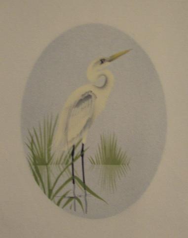 The painting portrays a white egret, poised elegantly on one leg amidst a marsh, its head turned to the side in a contemplative gesture. Encased within a pale blue oval that suggests the sky, the scene is grounded by green plants at the base, evoking the tranquility of a natural habitat. The loose, impressionistic style of the artwork lends a dreamlike quality, inviting viewers to reflect on the serene beauty of this solitary bird in its peaceful surroundings.