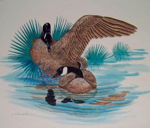 The painting is a serene portrayal of Two Ducks in a traditional Chinese setting, standing on a grassy area surrounded by an array of flowers and plants. The light blue sky dotted with white clouds forms a tranquil backdrop, while the ducks themselves are depicted with detailed feathers and realistic colors. The traditional Chinese style is evident in the soft colors and brushstrokes, creating a harmonious and peaceful scene. The painting is signed with Chinese characters in the lower left corner, adding to its authenticity and cultural significance. Overall, the artwork captures the essence of a calm and picturesque moment in nature.