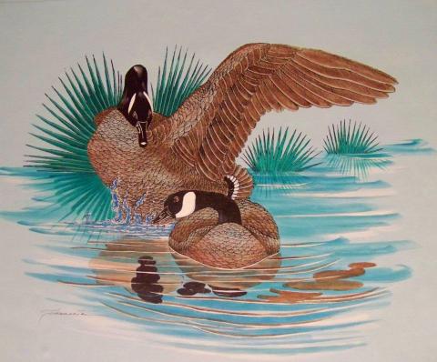 The painting is a serene portrayal of Two Ducks in a traditional Chinese setting, standing on a grassy area surrounded by an array of flowers and plants. The light blue sky dotted with white clouds forms a tranquil backdrop, while the ducks themselves are depicted with detailed feathers and realistic colors. The traditional Chinese style is evident in the soft colors and brushstrokes, creating a harmonious and peaceful scene. The painting is signed with Chinese characters in the lower left corner, adding to its authenticity and cultural significance. Overall, the artwork captures the essence of a calm and picturesque moment in nature.