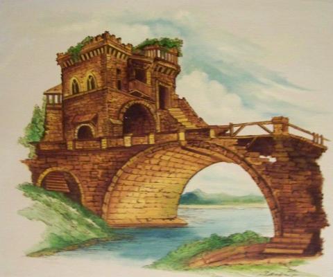 The artwork presents a romanticized castle-like structure perched atop a brick arch bridge that spans a tranquil river. The bridge’s architecture is reminiscent of medieval times with its tower and battlements, suggesting a historical or fantasy setting. The wooden railing along the bridge adds a rustic charm, while the calm waters below reflect the serenity of the scene. A tree stands on the far bank, contributing to the natural beauty of the location. Above, a blue sky dotted with clouds completes the picturesque setting. Unfortunately, the specific location of this idyllic scene is not identified in the painting, leaving it to the viewer’s imagination to fill in the geographical context.