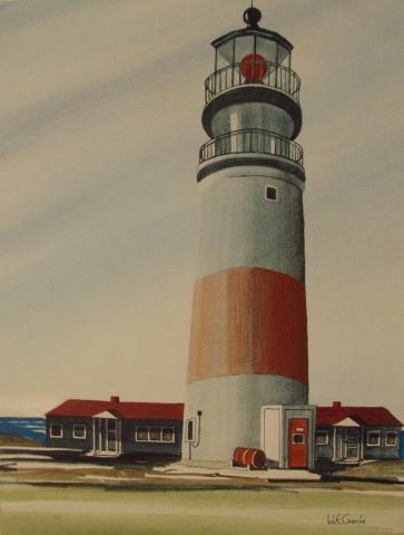 The painting portrays a serene beach setting featuring a lighthouse, which is white with a red top, standing as a beacon amidst small white buildings with red roofs. The clear blue sky dotted with white clouds adds to the tranquility of the scene. The artwork, signed by the artist in the bottom right corner, captures the essence of a coastal landscape, likely intended to evoke the peaceful and guiding nature of lighthouses. The specific location is not mentioned, but the style and elements suggest a typical seaside environment.