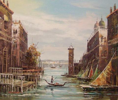 The painting captures the essence of Venice, Italy, with a serene depiction of a Venetian canal. At the heart of the scene is a gondola, gracefully navigating the waterway, steered by a gondolier in traditional attire. The canal is flanked by tall, ornate buildings, their balconies and arches reflecting the city’s rich architectural heritage. The artwork, rendered in an impressionistic style, uses a palette of earth tones against a backdrop of blue sky and water, evoking the timeless beauty and romantic spirit of Venice.