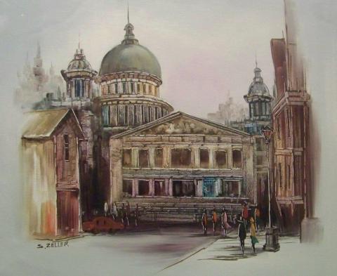 The painting presents a majestic view of a renowned European cathedral, captured in a realistic style from a street perspective. The cathedral, with its impressive large dome flanked by two towering spires, stands as a testament to architectural grandeur. Made of stone and adorned with numerous windows, it exudes a sense of historical significance and spiritual reverence. In the foreground, the daily life of the city unfolds as people walk by, adding a dynamic contrast to the cathedral’s enduring presence. Signed by S. Zeller in the bottom left corner, the artwork invites viewers to appreciate the intricate details and the harmonious blend of the sacred and the mundane.
