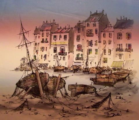 This painting is a depiction of a harbor scene in a coastal town. The painting shows a contrast between the lively and colorful buildings in the background and the old and worn-out boats in the foreground. The painting also captures the calmness and tranquility of the sea and the sky, creating a sense of harmony and balance. The painting is done in a loose, sketchy style with a limited color palette, giving it a rustic and impressionistic feel.