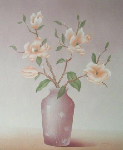 This is a painting featuring a bouquet of magnolias in a vase. The painting has a soft and gentle style, using light colors and fluid brush strokes. The peach and white magnolias stand out against the lavender vase and the muted background, creating a contrast and a focal point. The painting expresses a sense of calmness and elegance, as the artist captures the delicate nature of the flowers.