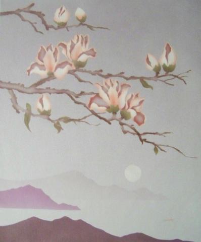 The painting portrays a tranquil scene adorned with delicate cherry blossoms, their soft pink and white hues evoking the freshness of spring. The branches stretch diagonally across the canvas, with flowers in various stages of bloom, set against a backdrop of misty mountains and a pale sky where a full moon gently illuminates the landscape. The subtle color gradients create an atmosphere of calmness and beauty, capturing the essence of these iconic springtime blossoms.