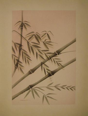 The painting depicts the serene elegance of bamboo, with three prominent stalks intersecting diagonally and adorned with slender leaves. The simplicity of the natural tones against the muted background emphasizes the bamboo’s graceful lines, evoking tranquility and harmony with nature. A signature or text is faintly visible in the bottom left corner, adding a personal touch to the minimalist composition. Overall, the artwork invites viewers to appreciate the peaceful beauty inherent in the simplicity of its subject.