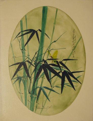The painting is a delightful composition that captures the serene beauty of nature, featuring bamboo stalks and leaves against a muted backdrop. The bamboo, painted with precision and grace, is a dark green that contrasts beautifully with the lighter background. A small yellow bird perches amidst the bamboo, adding a vibrant touch to the scene. The artwork, with its sense of calm and tranquility, is further enhanced by Asian characters inscribed in the top right corner, suggesting a cultural or personal significance to the piece.