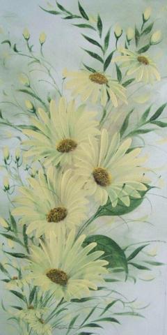 The artwork is a tranquil portrayal of pale yellow flowers, likely daisies, set against a backdrop of green foliage. The blossoms, with their brown centers, are depicted with gentle brush strokes, conveying a sense of peace and elegance. The composition is dynamic yet balanced, featuring flowers at different stages of bloom, which adds a touch of natural realism. The background’s soft muted tones provide a subtle contrast, highlighting the flowers’ vibrant hues and the delicate movement suggested by the leaves and petals.