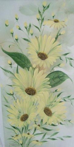 The artwork is a tranquil portrayal of pale yellow flowers, likely daisies, set against a backdrop of green foliage. The blossoms, with their brown centers, are depicted with gentle brush strokes, conveying a sense of peace and elegance. The composition is dynamic yet balanced, featuring flowers at different stages of bloom, which adds a touch of natural realism. The background’s soft muted tones provide a subtle contrast, highlighting the flowers’ vibrant hues and the delicate movement suggested by the leaves and petals.