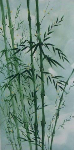 The painting portrays a peaceful scene of bamboo stalks, rendered in various shades of green that convey their natural elegance. The bamboo stands tall and slender, with delicate leaves that add a sense of gentle movement to the composition. The background is soft and muted, suggesting a distant view or sky, which allows the bamboo to be the sole focus. Overall, the artwork exudes a calm and tranquil atmosphere, likely achieved through watercolors or a similar medium, emphasizing the ethereal quality of the bamboo’s beauty.