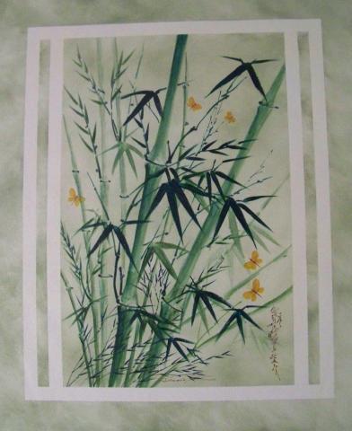 The painting portrays the serene beauty of bamboo, symbolizing tranquility and grace. The artist has masterfully used shades of green to render the bamboo stalks and leaves, which stand out against a muted background. The composition is both balanced and dynamic, with the leaves extending in various directions, suggesting stillness and movement. Intricate light and shadow play on the stalks and leaves enhances the depth of the scene. The artwork is framed by a lighter border, and there are some inscriptions in a non-Latin script at the bottom right corner, adding a cultural touch to the piece.