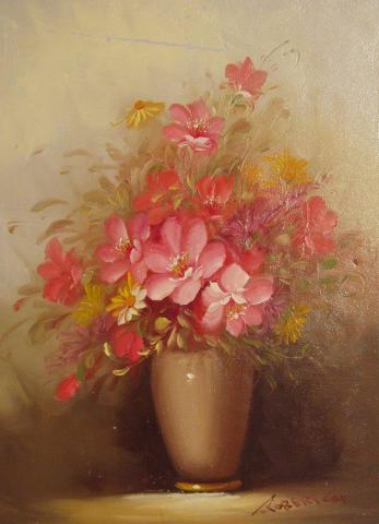 The painting portrays a beautiful and realistic bouquet of flowers in a light brown vase. The flowers are pink, red, and yellow, and they have different shapes and sizes. The vase is round and has a gold base, and it reflects some light from the background. The background is a light beige color, and it creates a contrast with the colorful flowers. The painting is signed by the artist in the bottom right corner, who is likely to be Robert Cox. The painting expresses the beauty and elegance of the flowers, as well as the artist’s skill and style.