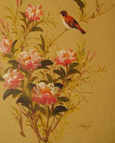 The painting is a depiction of a bird perched on a branch with pink and white flowers, set against a light beige background. The bird’s plumage is a mix of red and brown, and it faces to the right, as if observing its surroundings. The flowers, with their soft colors and green leaves, add a touch of natural beauty to the scene. The artist’s signature in the bottom right corner adds a personal touch to the artwork. The overall composition is one of harmony and tranquility, inviting the viewer to appreciate the delicate interplay between the bird and its floral habitat.