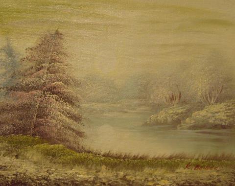 The painting is a realistic landscape of a serene lake flanked by trees, rendered in a muted color palette. Signed in the lower right corner, the artwork features predominantly green and brown tones, with the lake’s light blue-green water creating a tranquil focal point. The taller trees on the left side balance the smaller ones on the right, while the light yellow background adds a subtle warmth to the scene, inviting the viewer to experience the calmness of the natural setting.