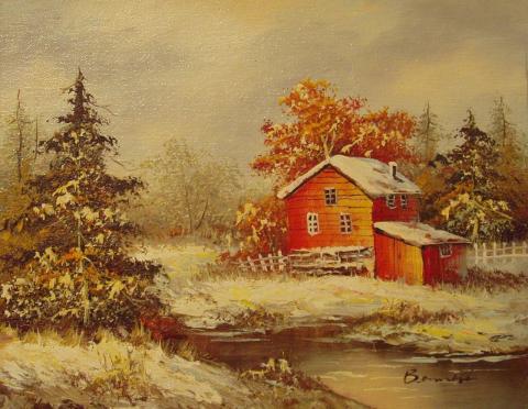 The oil painting showcases a vibrant red house, a striking contrast against the snowy landscape that envelops it. Surrounded by a collection of trees and a quaint wooden fence, the scene is further animated by a small stream meandering in the foreground. The warm colors used, particularly the red of the house, breathe life into the chilly scene, while the artist’s signature in the lower right corner marks the creation of this inviting winter tableau.