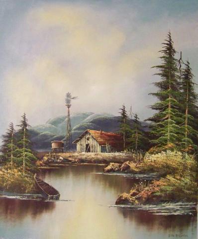 This painting captures a serene and picturesque landscape, where a rustic cabin with a water tank and windmill is nestled amidst lush greenery. The cabin, partially constructed or in disrepair, sits by the edge of a tranquil pond that reflects the surrounding nature. Tall pine trees stand majestically around the cabin, while rolling hills in the background are enveloped in mist, adding an element of mystique to the scene. The overall atmosphere evokes feelings of solitude and peaceful isolation.