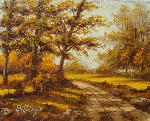 The painting is a charming depiction of an autumnal forest path, where the vibrant shades of orange and yellow trees create a canopy over a trail lined with fallen leaves. The artist has signed the work in the bottom right corner, adding a personal touch to this tranquil scene. The warm colors and the winding path invite the viewer to imagine a leisurely stroll through the crisp autumn air, surrounded by the natural beauty of the changing season.