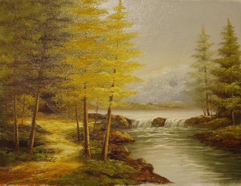 The painting captures a serene landscape where a river flows gracefully through the center, flanked by trees and rocks that add texture and depth to the scene. The background features a hazy sky that imparts a sense of tranquility and vastness. The realistic style of the painting, combined with the predominantly green and yellow color palette, evokes the freshness of nature. The artist’s signature in the lower right corner suggests a personal connection to the landscape, inviting viewers to immerse themselves in the peacefulness of the depicted environment.