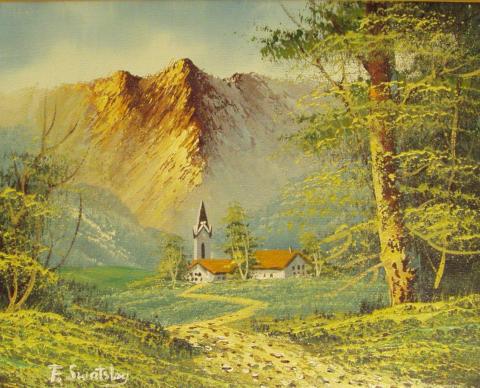 The painting is a realistic depiction of a mountain landscape, where a church and a house stand prominently in the foreground. the artwork is rich in detail and texture, with a color palette of green and yellow that brings the scene to life. The mountain range in the background, with its central peak, adds a sense of majesty, while the church’s steeple and the house’s red roof draw the eye. A dirt path leads to these structures, inviting the viewer into the painting’s serene world, framed and displayed on canvas.