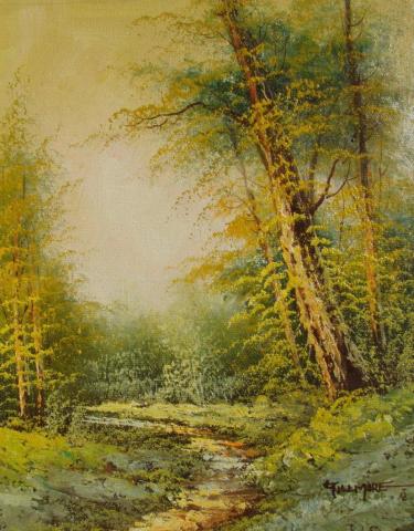 The painting is a loose impressionistic depiction of a forest, where a small stream gently flows through the verdant landscape. The artist has employed a palette of green and yellow with touches of brown and white to capture the rich textures and colors of the trees and foliage. The artwork, signed in the lower right corner, is presented on canvas and remains unframed, inviting the viewer to immerse themselves in the natural beauty and tranquility of the scene.