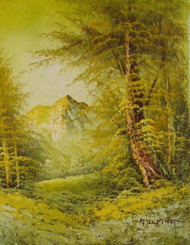 The painting showcases a picturesque landscape with a mountain backdrop and a coniferous tree in the foreground. The realistic style captures the scene in a green and yellow color palette, highlighting the mossy trunk of the tree and the rocky, snow-capped peak of the mountain. Signed in the bottom right corner, the artwork conveys a sense of natural grandeur and the enduring beauty of the wilderness.
