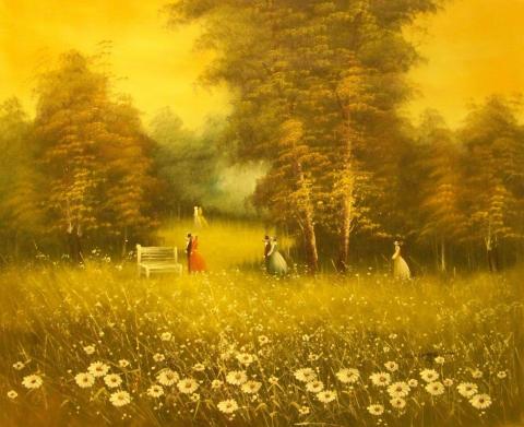 This painting captures a serene and idyllic scene set in a lush meadow, surrounded by tall, dense trees. The golden hue of the sky casts a warm glow over the entire landscape, enhancing the tranquil atmosphere. In the foreground, white flowers with prominent petals are scattered across the grassy field. Three individuals are depicted amidst this natural beauty; their attire suggests a period setting. A bench is also visible in the scene, inviting viewers to immerse themselves in this peaceful setting.