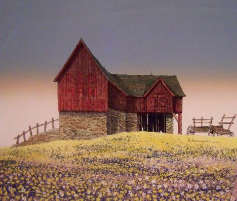 This painting captures a serene and picturesque rural scene. A rustic barn, with its weathered red wooden upper structure and stone foundation, stands prominently amidst a field blanketed with yellow flowers. The barn’s aged appearance tells a story of years gone by. To the left, a simple wooden fence stretches out, adding to the pastoral charm of the scene. In the foreground, an old-fashioned wooden cart rests abandoned, evoking a sense of nostalgia. The sky above transitions gracefully from a soft orange hue at the horizon to a deeper blue, casting an ethereal glow that bathes the entire landscape in warm light.