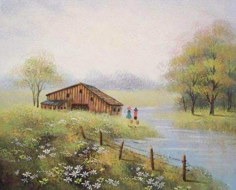The painting depicts a tranquil rural setting, where an aged wooden barn stands amidst a vibrant display of greenery and wildflowers. A calm body of water mirrors the natural beauty, enhancing the scene’s peacefulness. In the distance, two figures enjoy a leisurely walk along the water’s edge, further emphasizing the idyllic and dreamlike quality of the landscape. The misty backdrop and soft lighting infuse the painting with a sense of timelessness and serenity.