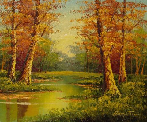 The painting is a tranquil autumn scene, where trees adorned with orange leaves stand by a gently flowing river, painted in a light green hue. The background is graced by a blue sky and additional greenery, creating a harmonious blend of colors that evoke the peacefulness of the season. The impressionistic style of the painting, signed by the artist in the bottom right corner, adds a sense of movement and life to the stillness, inviting the viewer to immerse themselves in the beauty of this idyllic setting.