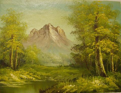 This painting captures a serene natural landscape, where the tranquility of a lush green forest meets the majesty of a towering mountain. The foreground is adorned with detailed, verdant trees and shrubs, their leaves reflecting the soft light that filters through. A calm body of water mirrors the beauty above it, leading the viewer’s gaze towards the imposing mountain that stands tall in the background. The mountain, bathed in light and shadow, adds a dramatic contrast to the peaceful surroundings. Every brushstroke comes together to create an atmosphere of serene beauty, inviting viewers into this idyllic natural world.