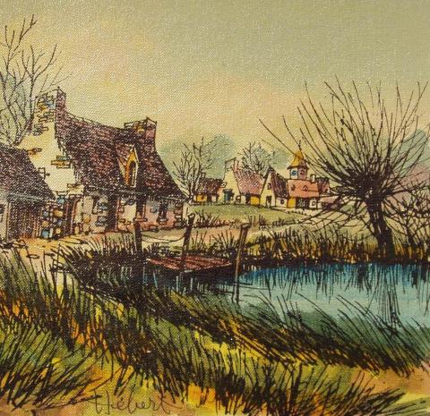 The painting presents a captivating rural landscape, imbued with the warmth of a loose, impressionistic style. It showcases a small village nestled in the distance, while the foreground is dominated by the rich textures and colors of the natural surroundings. The artist has skillfully used a palette of warm yellows and oranges to depict the sky, contrasting with the greens and blues of the landscape, creating a harmonious blend that invites contemplation. The artwork, signed by the artist in the lower right corner, is a testament to the beauty of simplicity and the allure of the countryside.