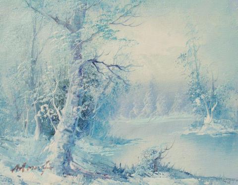 The painting is an impressionistic interpretation of a snowy landscape, where bare trees stand against the backdrop of a frozen lake. The color palette is dominated by shades of blue and white, with subtle brown and green accents that add depth and warmth to the scene. The mood is one of serene stillness, as the pale blue sky diffuses light across the canvas, enhancing the peaceful atmosphere. The artwork invites the viewer to embrace the quiet beauty of winter and the gentle hush that comes with a blanket of snow.