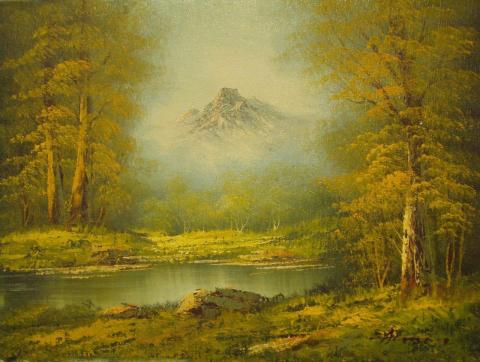 The painting is a landscape that features a mountain in the background with a lake in the foreground, executed in a realistic style. The scene is rich with greenery and trees, creating a vibrant natural setting. The mountain, covered in snow, stands as a majestic centerpiece, while the lake, surrounded by trees, adds a sense of tranquility. The use of a green and blue color palette enhances the painting’s overall feeling of calmness and beauty.