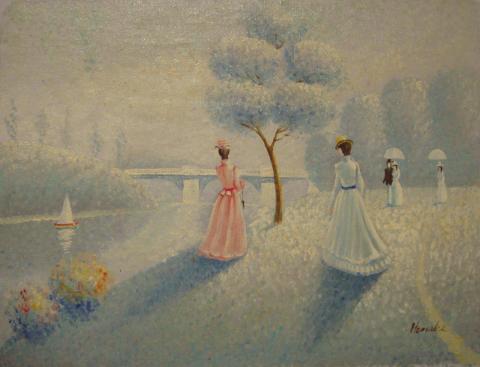 The painting depicts a tranquil natural landscape. A calm river flows in the foreground surrounded by rocks and greenery. Birch trees with autumnal leaves are prominently featured on both sides of the image. In the distance, there is a snow-capped mountain rising majestically. The sky is painted with soft hues suggesting either dawn or dusk. A misty atmosphere pervades the scene adding an ethereal quality.
