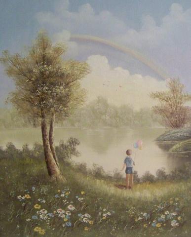 The painting depicts a tranquil natural setting, where a child holding balloons stands by the edge of a calm lake, surrounded by a vibrant display of greenery and wildflowers. A prominent tree with dense foliage anchors the left side of the composition, while in the distance, more trees line the lake’s far shore beneath a sky dotted with soft clouds. A gentle rainbow adds a whimsical touch to the scene, arching gracefully across the sky and infusing the landscape with a sense of wonder and serenity. The artwork invites viewers into a peaceful moment, where the simplicity of childhood meets the beauty of nature.