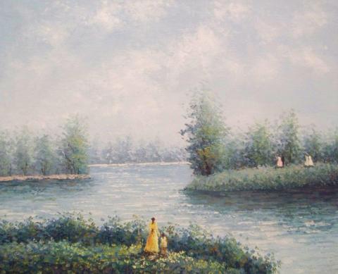The painting captures a serene and picturesque landscape, where a person in a yellow dress stands amidst lush greenery, gazing at the tranquil waters of a river. The river is bordered by abundant trees and vegetation, conveying an atmosphere of solitude and natural beauty. The sky above is painted with soft, diffused clouds that spread across the canvas, adding to the overall calm and peaceful mood of the scene.