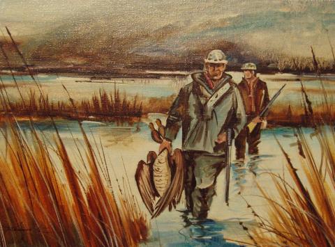 The painting presents a tranquil scene of a hunting expedition in a marshland. Two individuals, obscured by the tall golden reeds, are engaged in the activity, with one prominently holding the spoils of their hunt. The artwork conveys a sense of calmness through the soft, blended hues of the sky, suggesting the time is either dawn or dusk. The impressionistic style, marked by visible brush strokes, enhances the serene yet active atmosphere of the scene.
