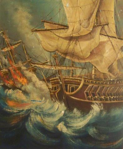 The painting depicts a naval battle scene, where a large ship with billowing sails is in the center of the turbulent sea. The ship is a three-masted sailing ship with a golden figurehead. The ship is sailing towards the left side of the painting and is surrounded by smoke and fire. A smaller ship is on fire in the background. The sky is dark and stormy. The painting is done in a realistic style, with fine details and accurate proportions. The painting conveys a sense of drama and danger at the high seas.