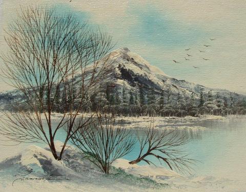 The painting is a serene depiction of a snowy mountain landscape with a lake and bare trees, executed in a realistic style. The artist has used a muted color palette to convey the quiet beauty of the scene. The snow-covered mountain rises in the background, while the pale blue lake occupies the foreground, reflecting the subtle colors of the sky. The bare trees add a sense of stillness and solitude to the composition. The sky, a pale blue with a few clouds and birds, suggests the crispness of a winter day. Overall, the painting, done in oil on canvas, captures the peaceful essence of a winter’s day in nature.