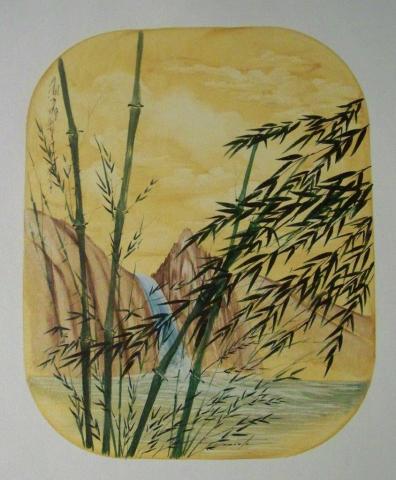 The painting captures a serene natural landscape, dominated by tall bamboo stalks that sway gracefully, their delicate leaves detailed against a warm yellow backdrop suggestive of sunrise or sunset. The mountainous terrain, subtly visible through the bamboo, adds depth and dimension to the composition. The artwork, with its oval border, exudes tranquility and harmony with nature, and appears to be a watercolor painting given the soft blending of colors.